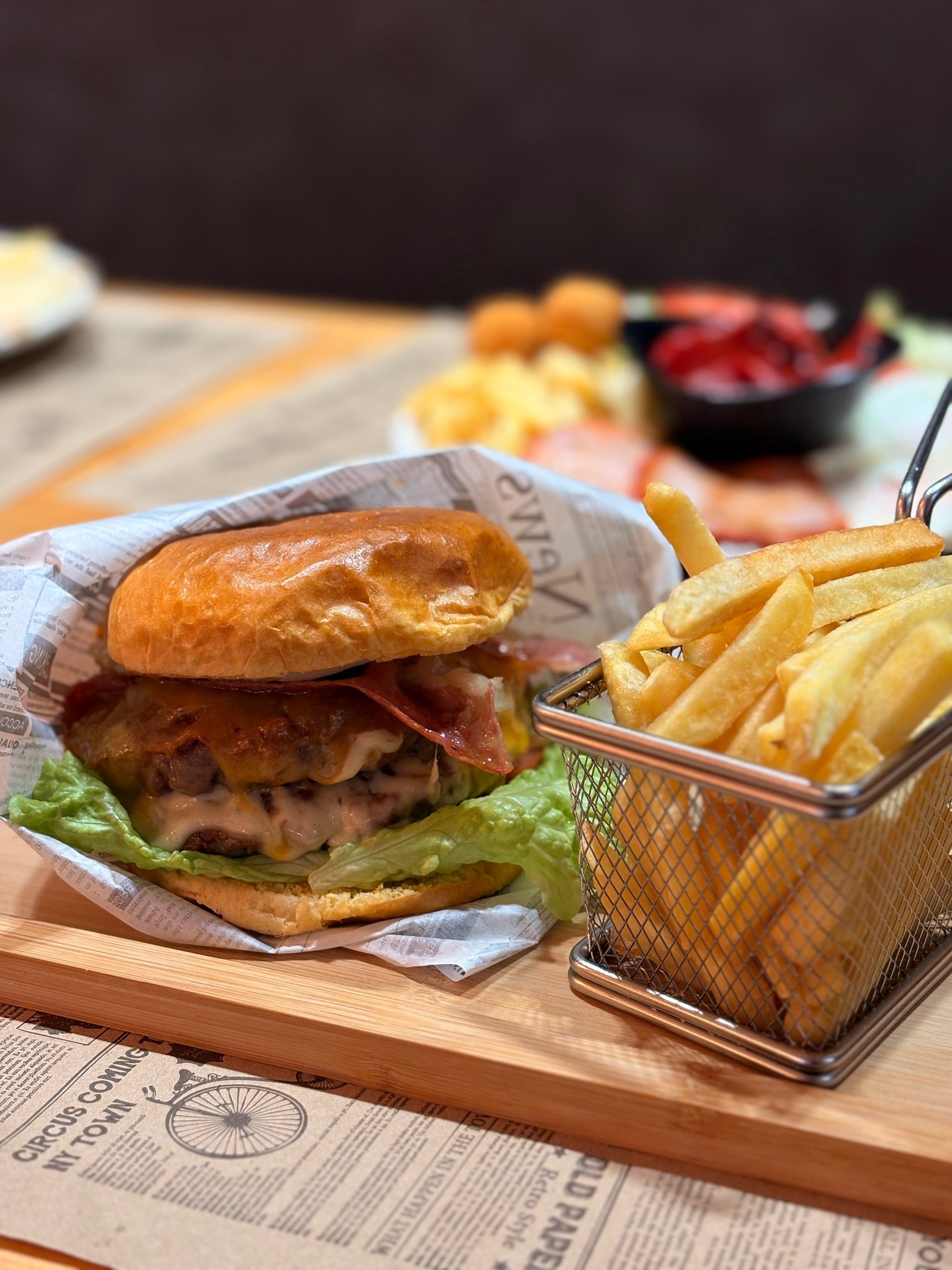 N°6. Hamburguesa con queso y beicon, croquetas, ensalada y patatas fritas. 14,90€