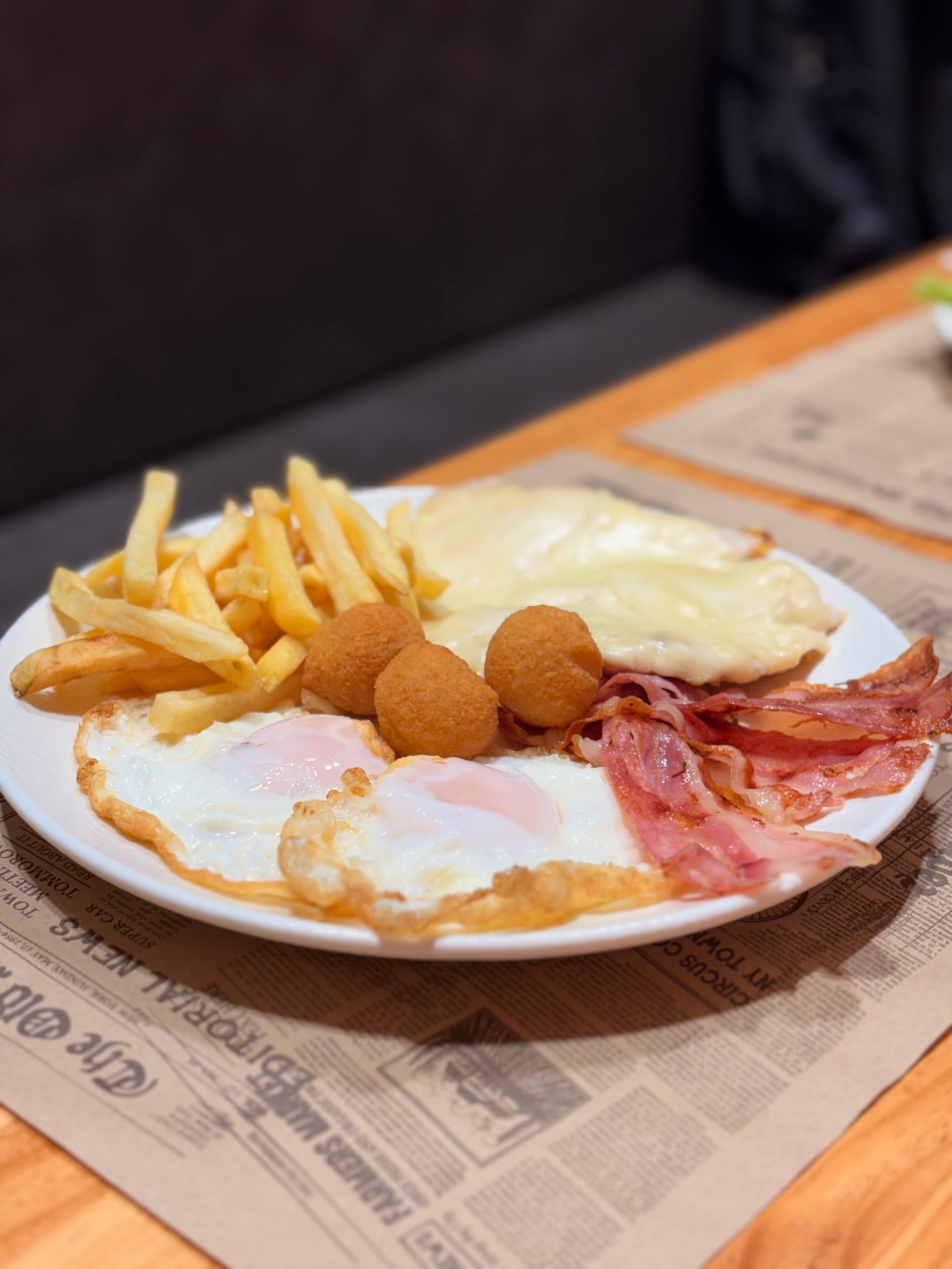 N°10. Huevos fritos, beicon, croquetas, patatas y ensalada. 12,80€