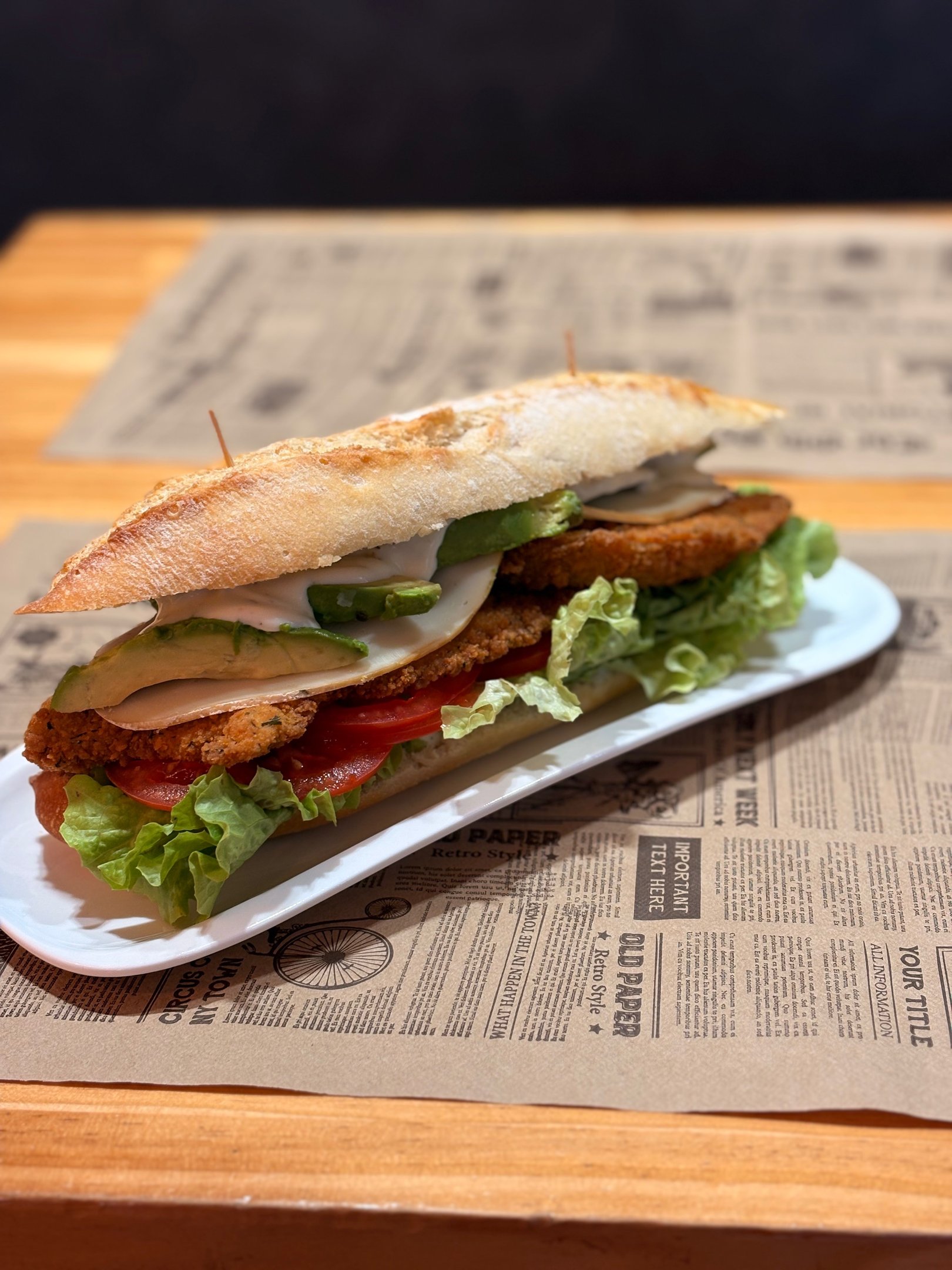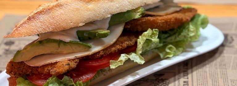 DE POLLO EMPANADO.- Filete de pechuga empanada, huevo a la plancha, queso de cabra, salsa césar, cebolla caramelizada, jamón ahumado, lechuga y tomate en pan rústico. 9,10 €