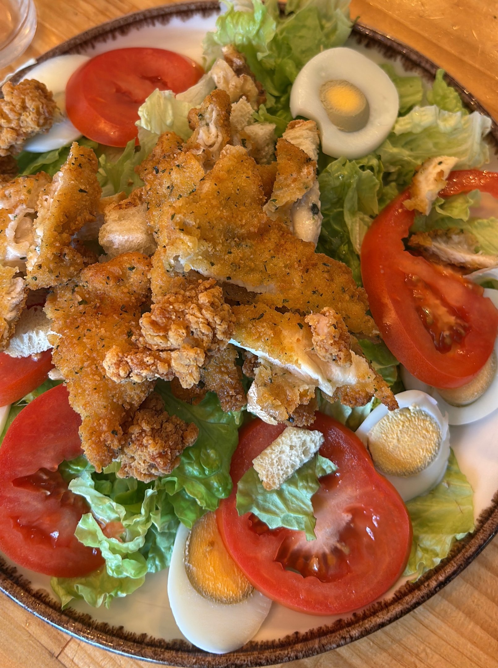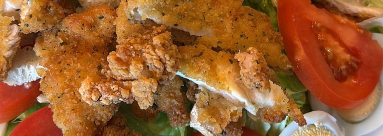Ensalada de Pollo Crujiente con Salsa de Yogur.-Lechuga, tomate, huevo cocido, pollo empanado, nueces y salsa de yogur. 13.70 €