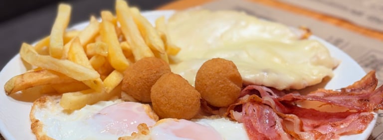 Nº8. Pechugas de pollo con queso y beicon, 2 huevos fritos, croquetas y patatas. 14,90€